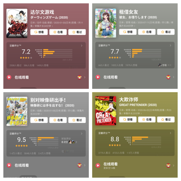 《達爾文游戲》(該番播放量破億),《大欺詐師》,《日本沉沒2020》、《租借女友》、《別對映像研出手》等等都在二次元圈內、豆瓣上頗受好評。其中一部番劇很有戲劇性,《租借女友》起初在B站漫畫頻道熱度排名第三,動畫化之前B站也為此導流不少,但最后A站截胡,拿下動畫獨播權,吸引了不少二次元用戶。