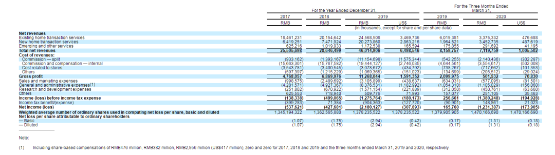 隨之而來(lái)的是年?duì)I收突發(fā)猛進(jìn)。招股書(shū)顯示,貝殼找房2018年、2019年、2020年一季度營(yíng)收分別為286.46億元、460億元、71.2億元。收入主要來(lái)自住房交易和服務(wù)的傭金,其中2019年二手房交易和新房交易收入分別為246億元人民幣和202億元人民幣。不過(guò),貝殼尚未盈利,同期凈虧損分別為4.27億元、21.8億元和12.31億元。